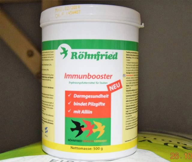 Suplement diety dla gołębi z serii poprawia szybkość reakcji układu odpornościowego gołębi i tym samym ich zdrowie. Zawiera on również funkcjonalne pierwiastki śladowe, takie jak siarka i cynk oraz inowacyjną substancję wiążącą mykotoksyny grzybowe. Podobnie jak Jungdierpulver także w Immunbooster zawarte są probiotyki, alliina oraz kolostrum białka wspierające odporność gołębi w fazie stresu.