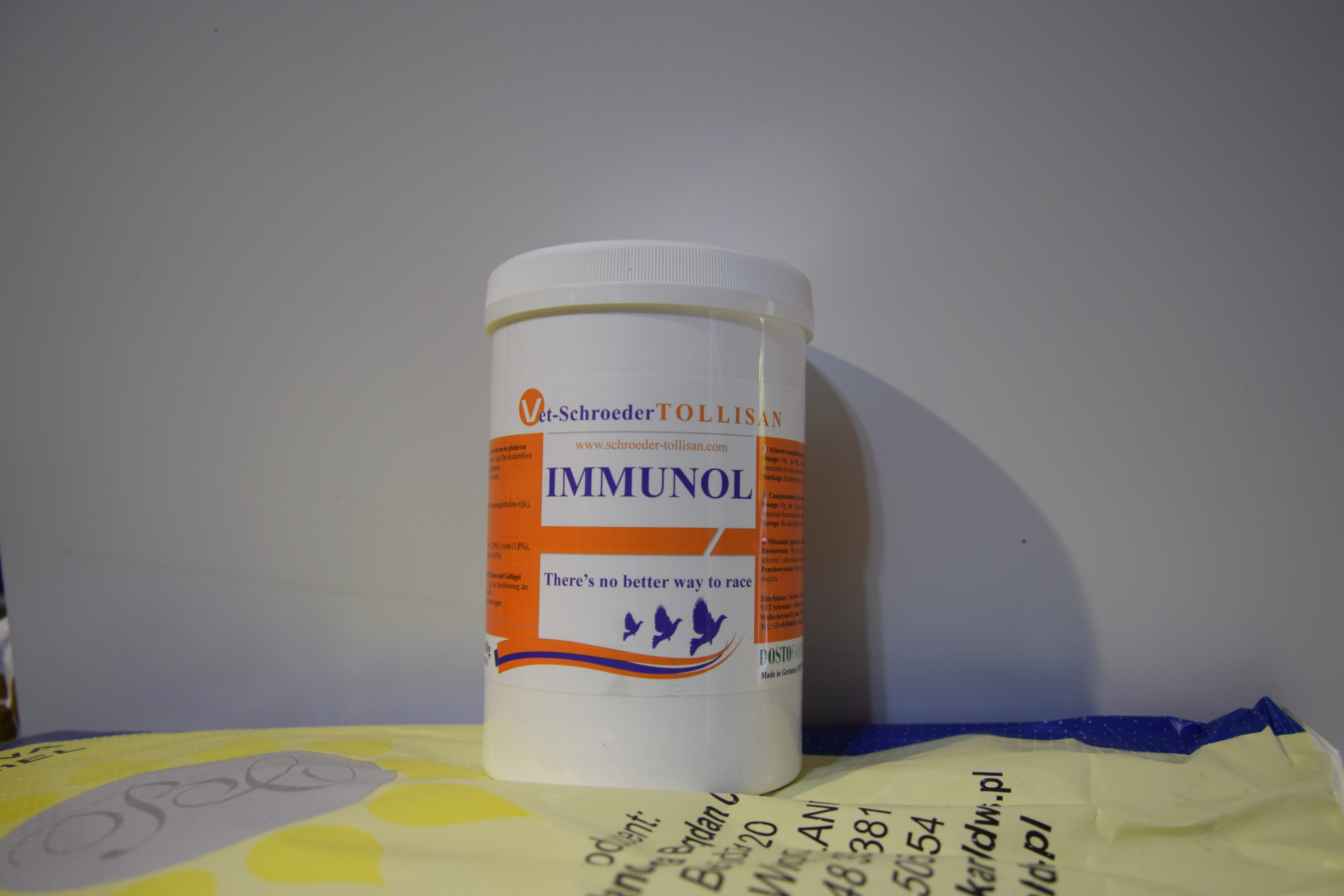 1. W dniu powrotu (dorosłe i młode) podawać rano i wieczorem. Najpierw nawilżyć karmę Dosto-Oregano Futteröl następnie posypać ją Immunolem. Czas podawania to 2 – 3 dni w zależności od stopnia utraty sił podczas lotu. Ponieważ ptaki muszą oczyścić organizm, podawać lekką karmę o dużej zawartości jęczmienia, bez roślin strączkowych (fasola, groch, wyka). Immunol zastępuje brakujące białko w karmie w 100%. Należy zdawać sobie sprawę ze stopnia koncentracji białka w produkcie. Podawanie mimo to karmy z roślinami strączkowymi spowoduje przekarmienie ptaków. Jest to jeden z największych błędów w sezonie lotowym. Zawarte w Immunolu aminokwasy lizyna i metionina powodują dodatkowo lepsze przyswajanie białka przez organizm, a minerał kondycji, fosfor, polepsza metabolizm. Każdemu gołębiowi, który z lotu powróci po kilku dniach i wygląda na wychudzonego, należy skropić wole rozpuszczonym w wodzie Immunolem (1 łyżeczka Immunolu na pół filiżanki letniej wody).