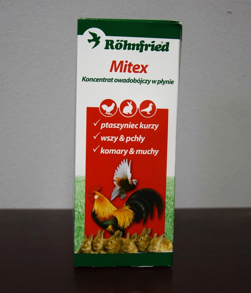 Mitex zawiera naturalną substancję o nazwie pyretrum będącą wyciągiem ze złocienia oraz insektycydy dające bardzo synergetyczny efekt. Ta kombinacja ma bardzo długotrwałe działanie. Niszczy skutecznie latające i pełzające owady jak roztocza, ptaszyńce kurze, wszy, pchły, piórojady, muchy, komary i karaluchy. Dzięki udoskonalonej kombinacji substancji czynnych działa na ofiary nie tylko paraliżująco ale także zabójczo. Mimo to jest produktem przyjaznym, ponieważ wykazuje niewielką toksyczność dla osobników stałocieplnych. Zastosowanie: Mitex można stosować bezpośrednio na siodełka i sprzęty znajdujące się w gołębniku oraz na wszystkie powierzchnie gołębnika. 100 ml produktu Mitex należy zmieszać z 2 litrami wody (w przypadku silnego ataku pasożytów, np. ptaszyńca kurzego, roztwór powinien się składać w jednej części z Mitex'u i jednej części wody i należy go stosować codziennie przez tydzień). Taką mieszanką należy potraktować cały gołębnik.