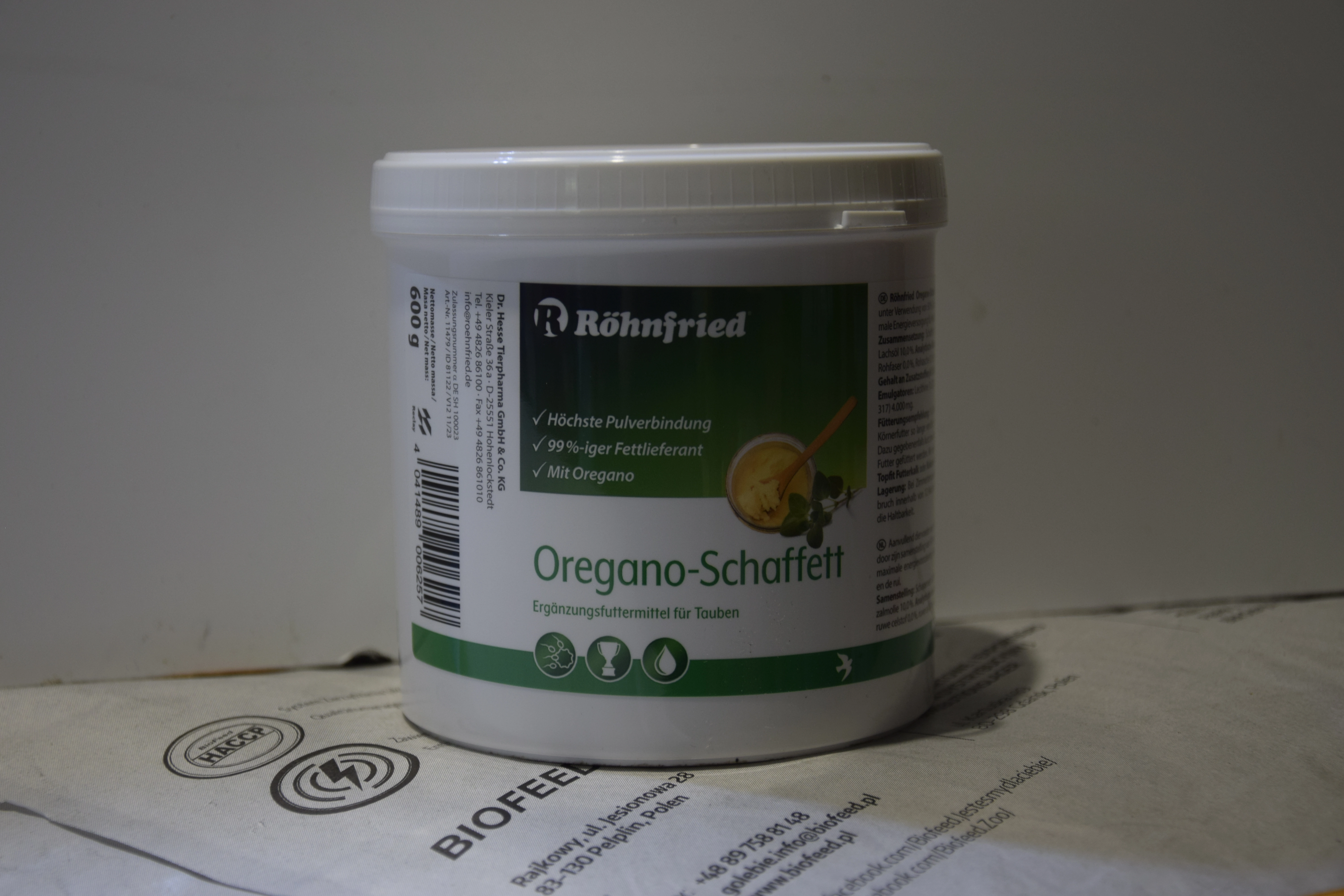 Oregano Schaffett to produkt zawierający 45% tłuszczu owczego i czysty olej z oregano stanowi najlepsze źródło energetyczne na loty konkursowe, trening, lęg, wychów młodych i pierzenie. Olej z oregano wspomaga procesy trawienne, a olej lniany dostarcza organizmowi nienasyconych kwasów tłuszczowych. Oregano-Schaffett odznacza sie poza tym ekstremalnie wysoką zdolnością wiązania form sproszkowanych. Zalecane stosowanie: 1-2 łyżki stołowe Oregano-Schaffett należy zmieszać z 1 kg karmy ziarnistej. (Mieszać do momentu rozprowadzenia produktu na wszystkie ziarna). W razie potrzeby produkt można lekko podgrzać. Tak przygotowaną karmę podawać gołębiom. W celu łączenia produktów zaleca się również stosowanie K+K Eiweiß® 3000, Topfit-Futterkalk, Premium Kräuter-Komplett-Mix lub Entrobac.